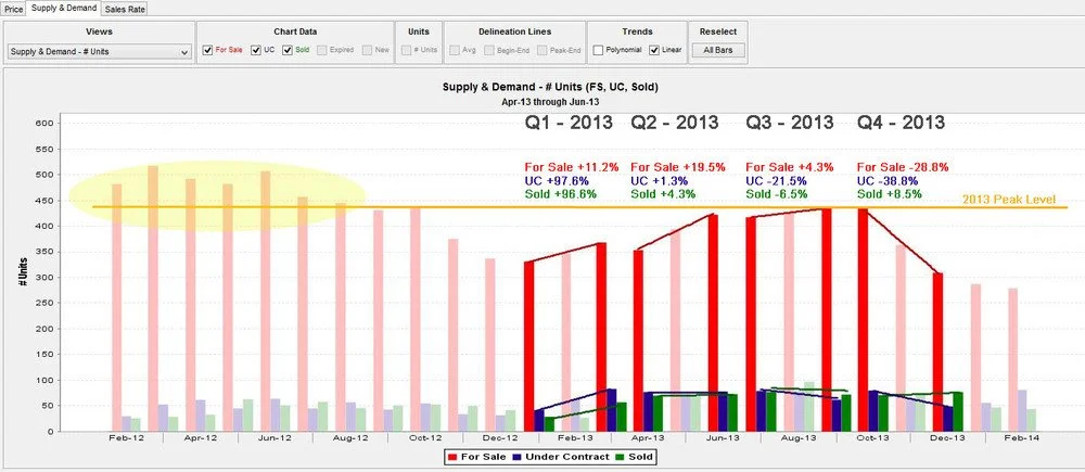 If you're a market timer, there's no question that planning a sale in Q1 2013 would have been advantageous. Between January and March, available properties for sale increased by 11% while properties that went Under Contact increased by over 97%. In hindsight, this was a great time to be on the market but real estate sales are typically reported 40-60+ days after the contract date, so there was no way to foresee this level of hyper-activity going into 2013. The flip side of selling early in 2013 is prices rose substantially throughout the year, so sellers in Q1 might have left money on the table.